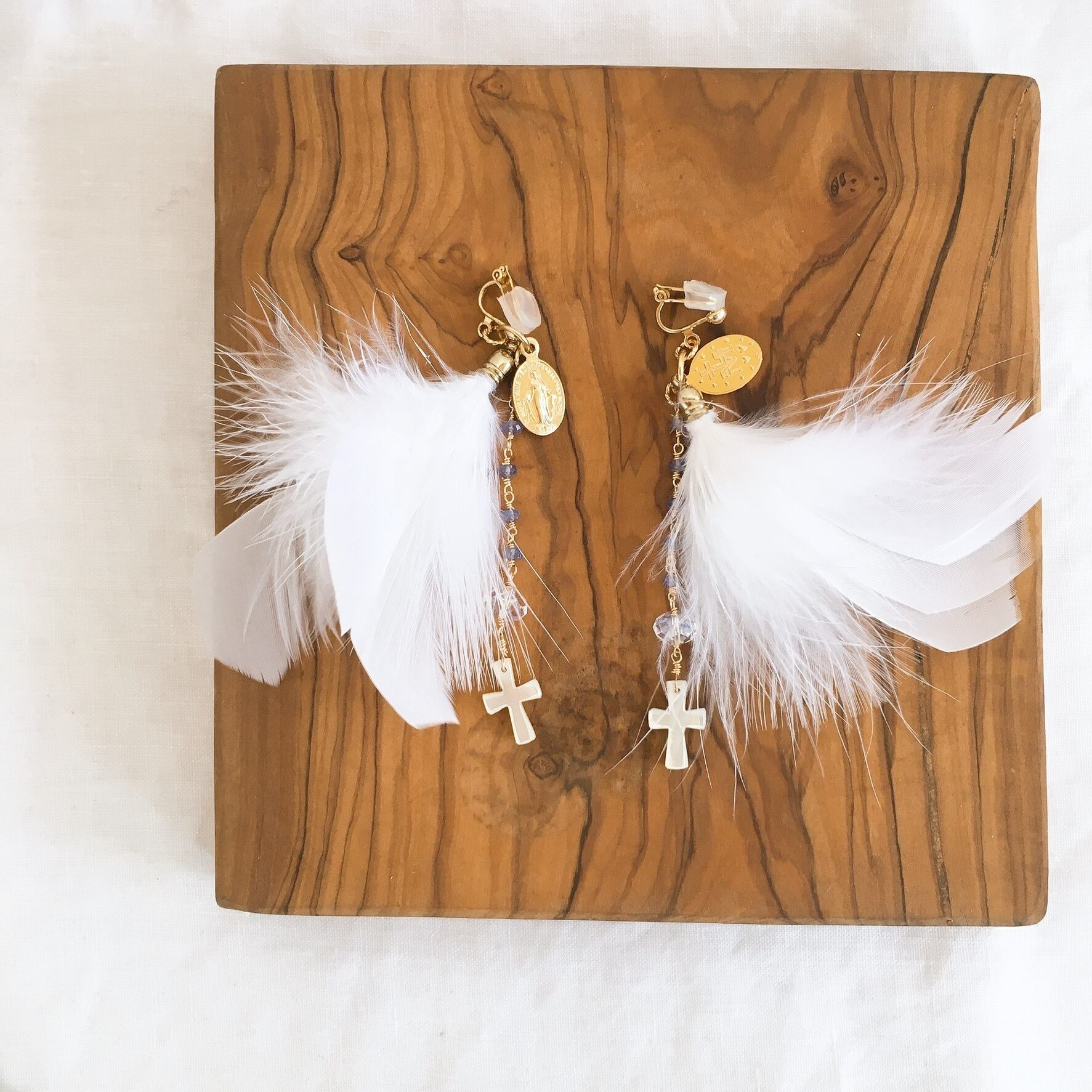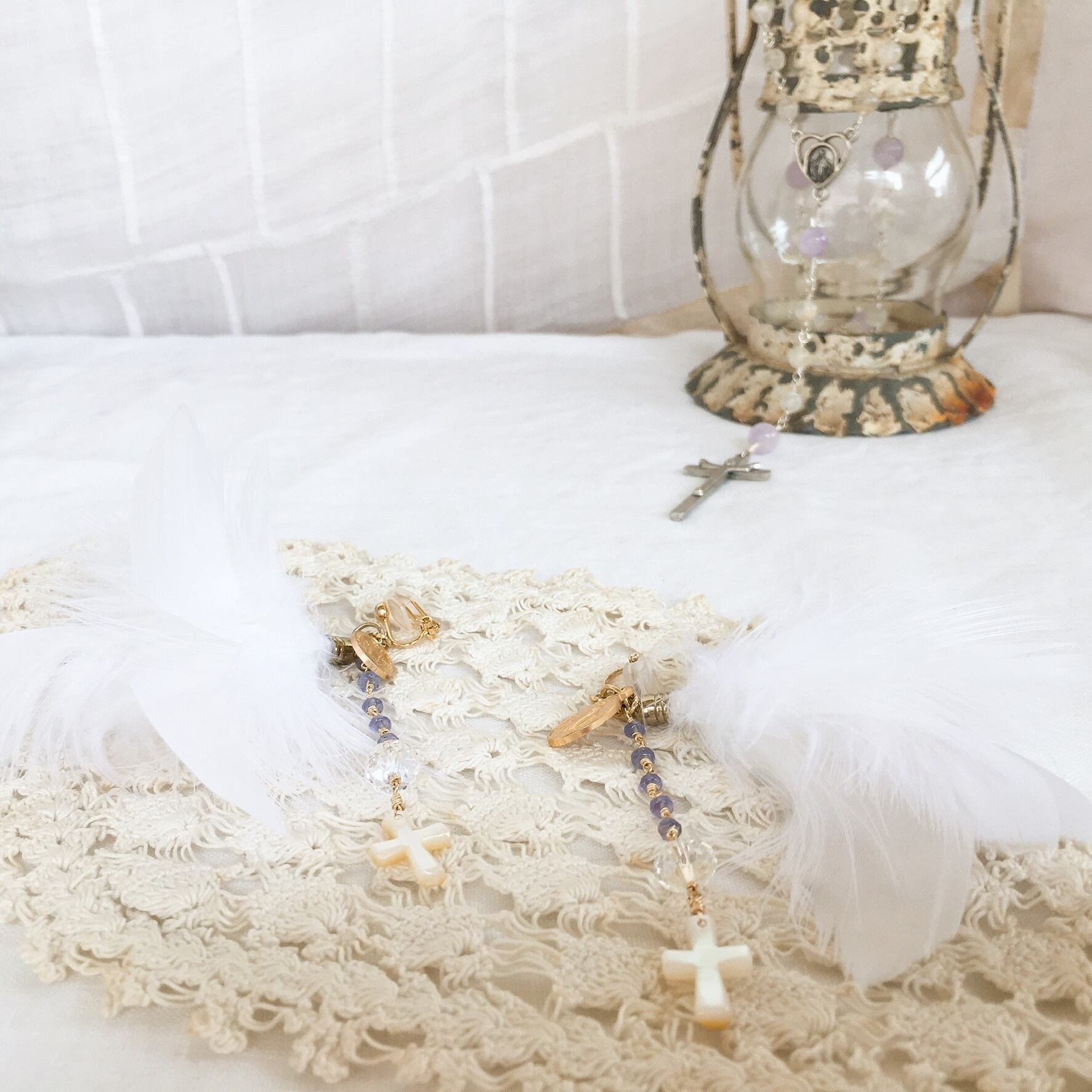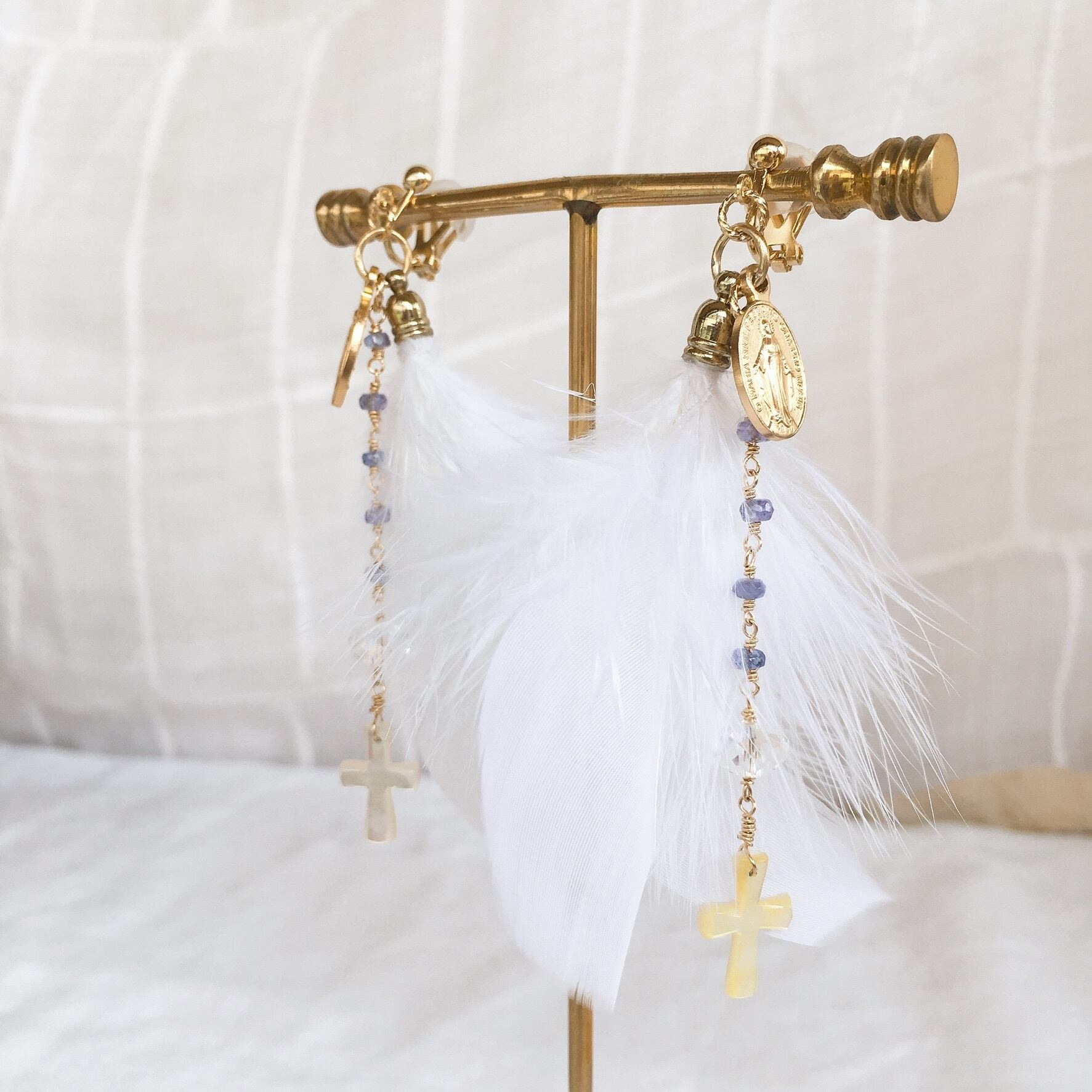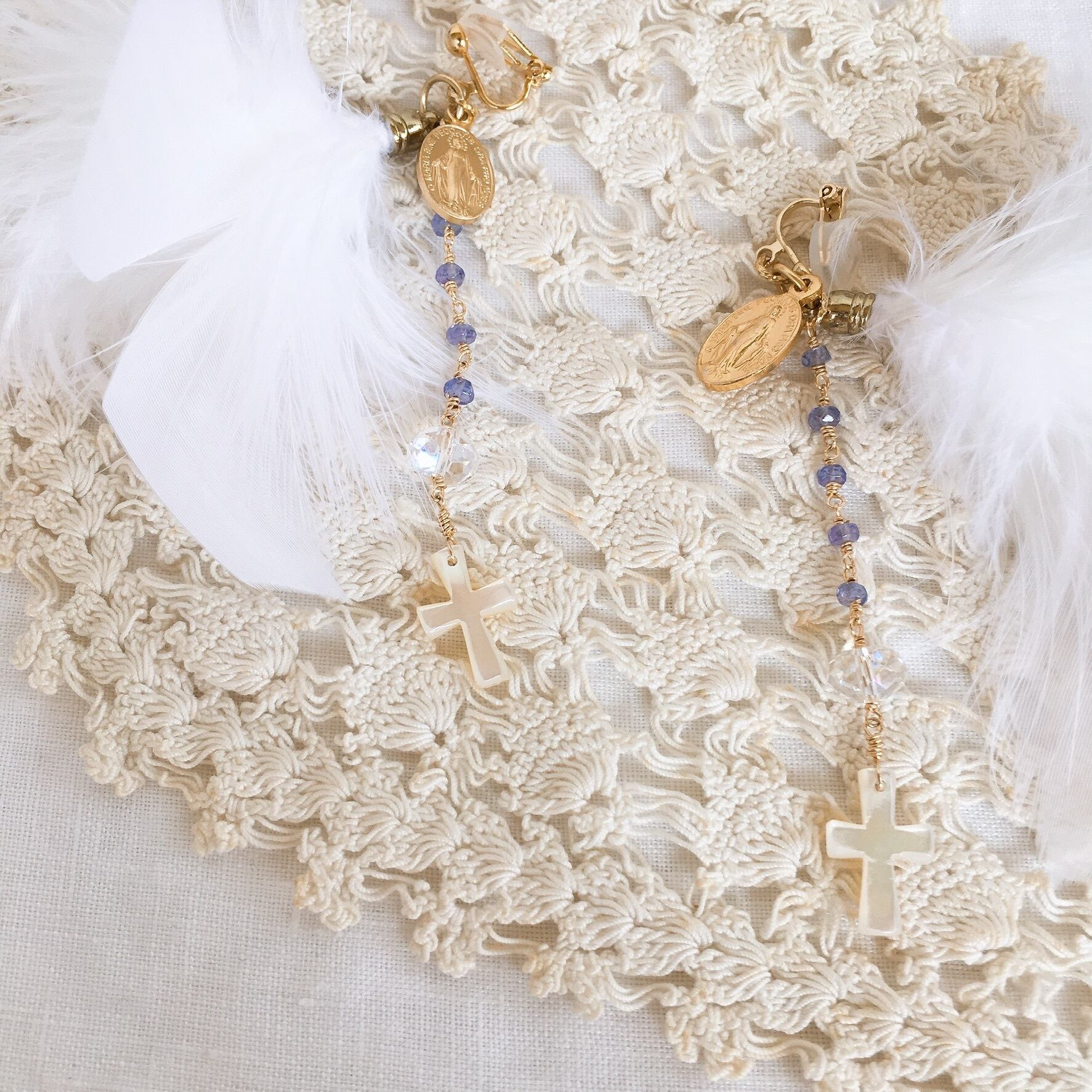 そんなマントのような色をした5粒の小さなタンザナイト、光を集める役割のスワロフスキービーズ、天使の羽根のように優しく包んでくれる真っ白なフェザーを使い、ロザリオのデザインの耳飾りを制作しました