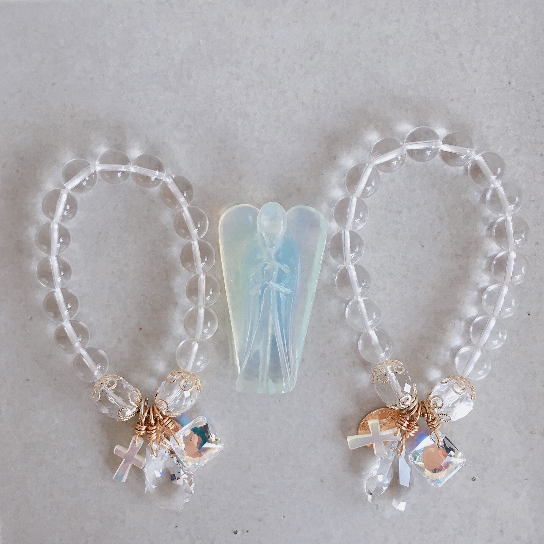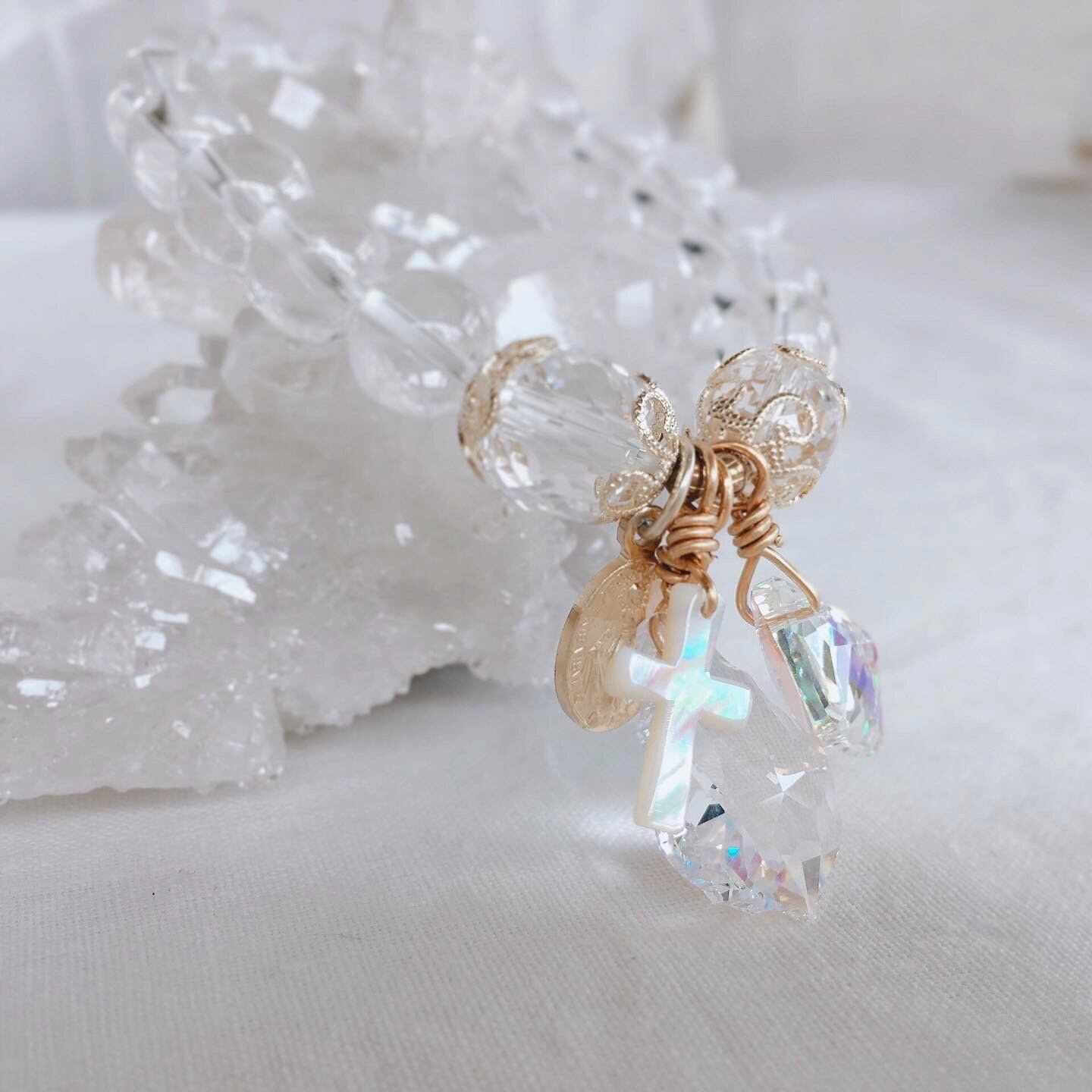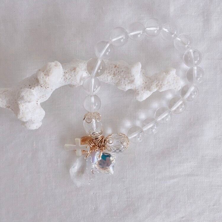 透明度の高いブラジル産の水晶、スワロフスキー社のシャンデリアパーツ、教会で購入したメダイ、シェルの十字架を使用