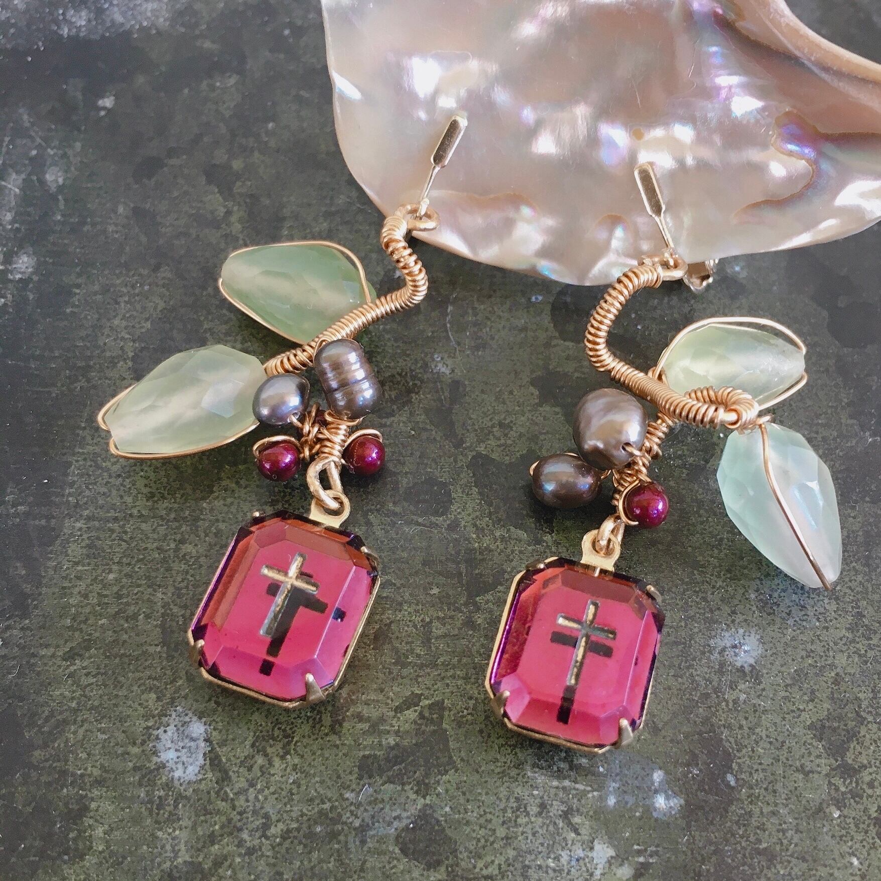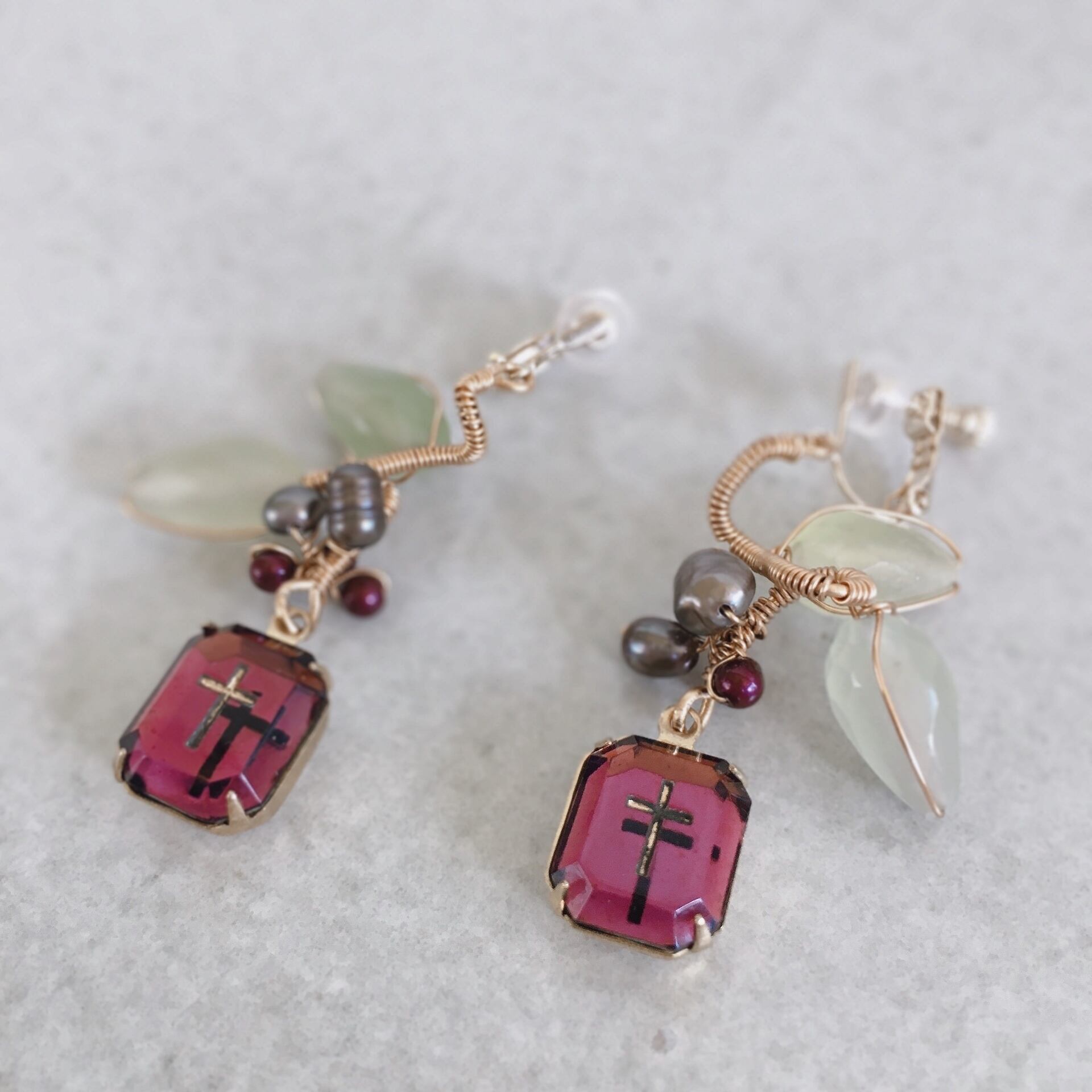 ヴィンテージの十字架パーツからイメージを膨らませ、教会やマリア様をモチーフに制作しました